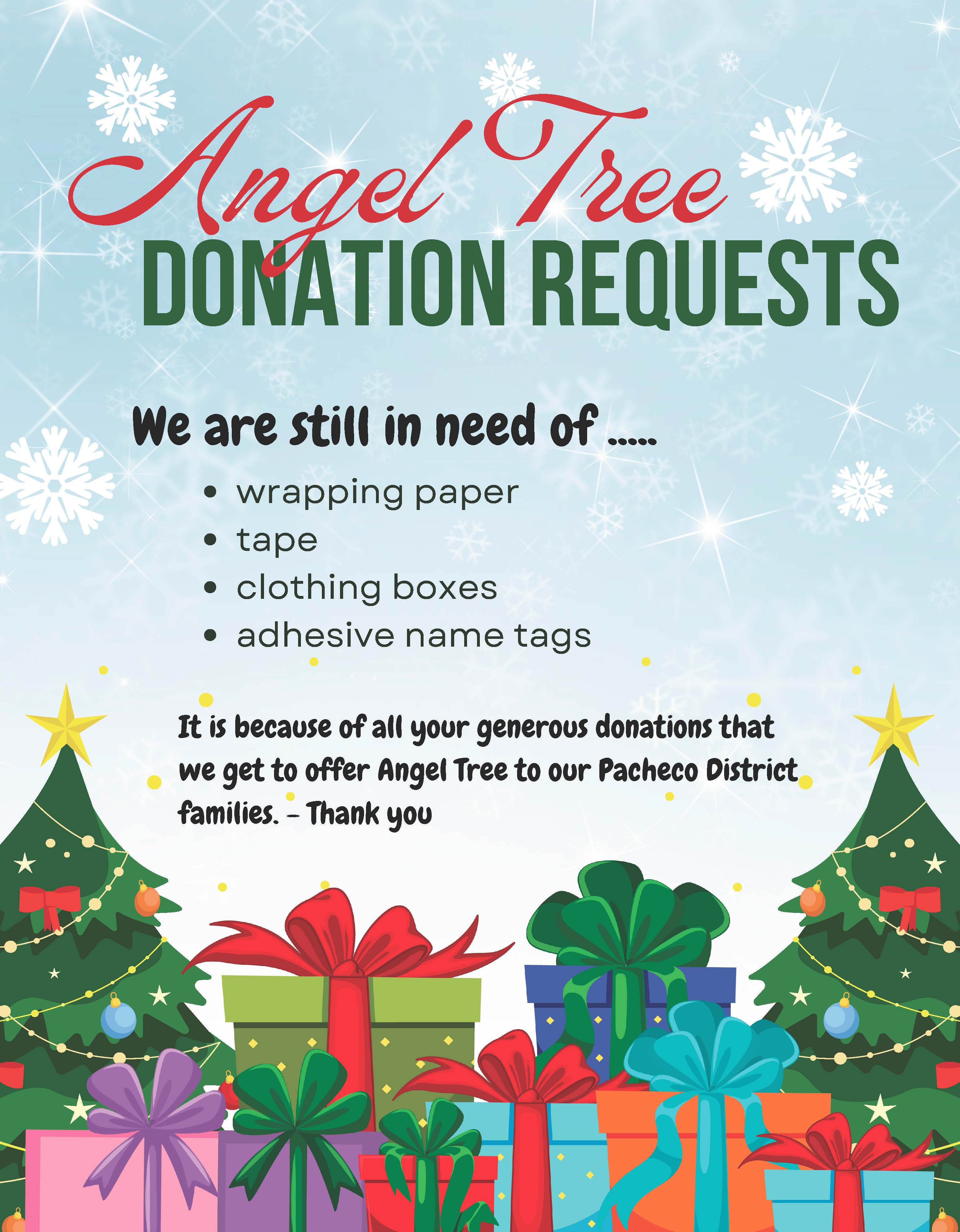 Parents and Guardians, we still need your support, there are several ornaments left on our Angel Trees at both Pacheco and Prairie.This holiday season, we invite you to help brighten a child’s Chri...
