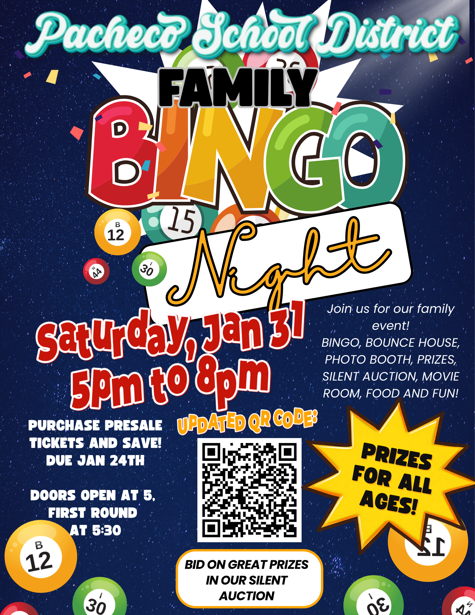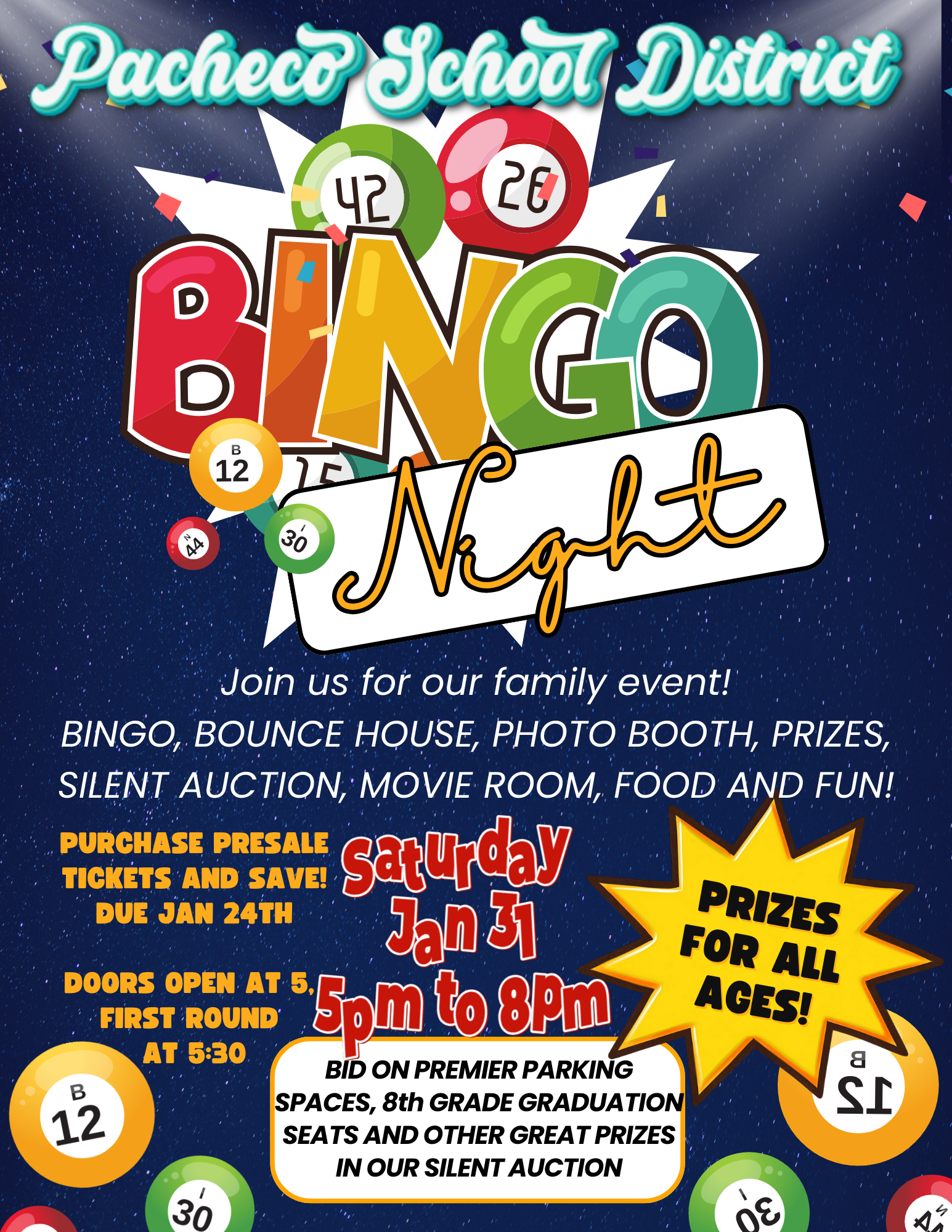JOIN US FOR OUR PPPTG EVENT!BINGO, BOUNCE HOUSE, PHOTO BOOTH, PRIZES, SILENT AUCTION, MOVIE ROOM, FOOD, AND FUN!SATURDAY, JANUARY 31 AT 5:00 PMPACHECO GYM